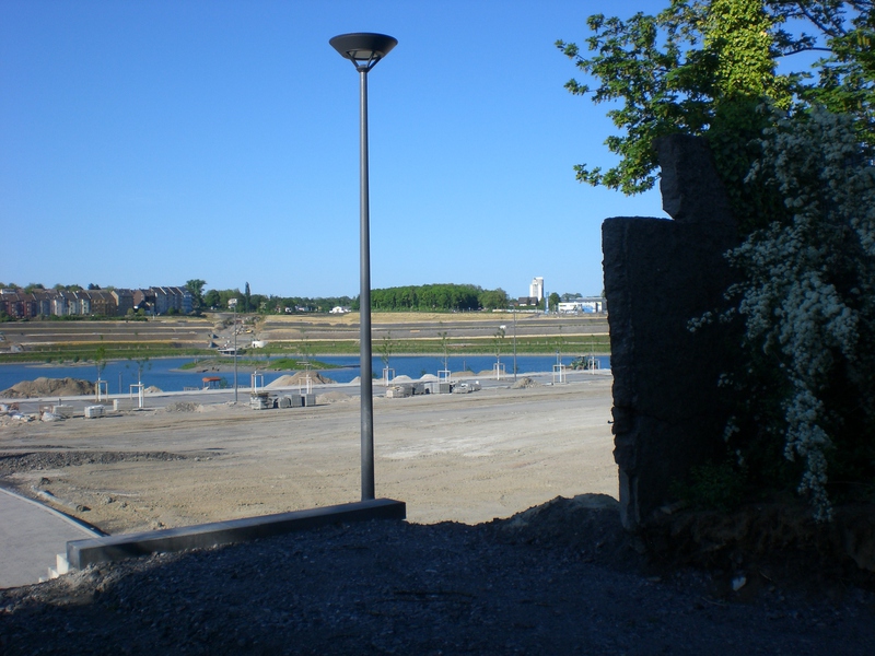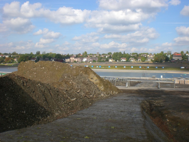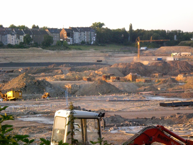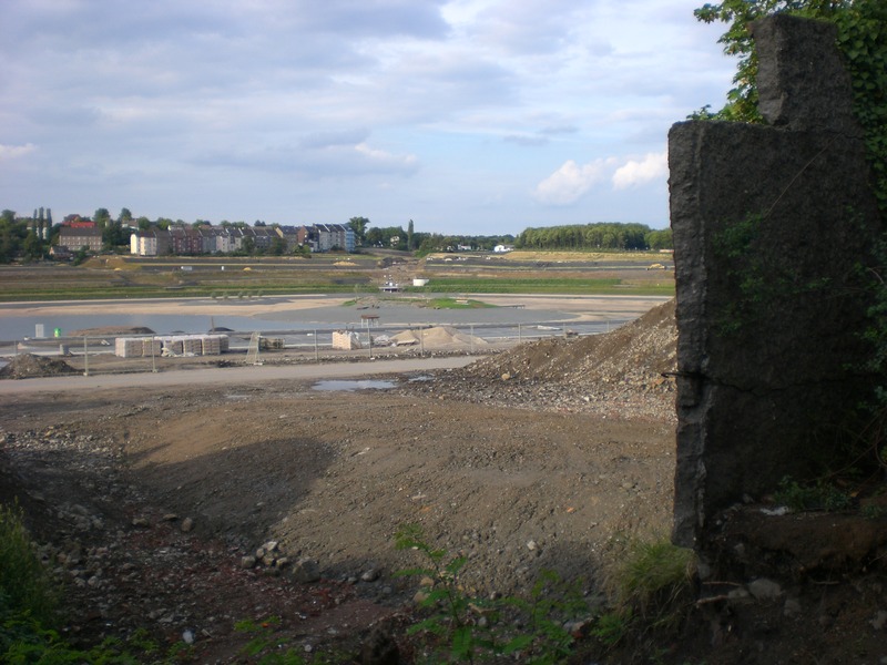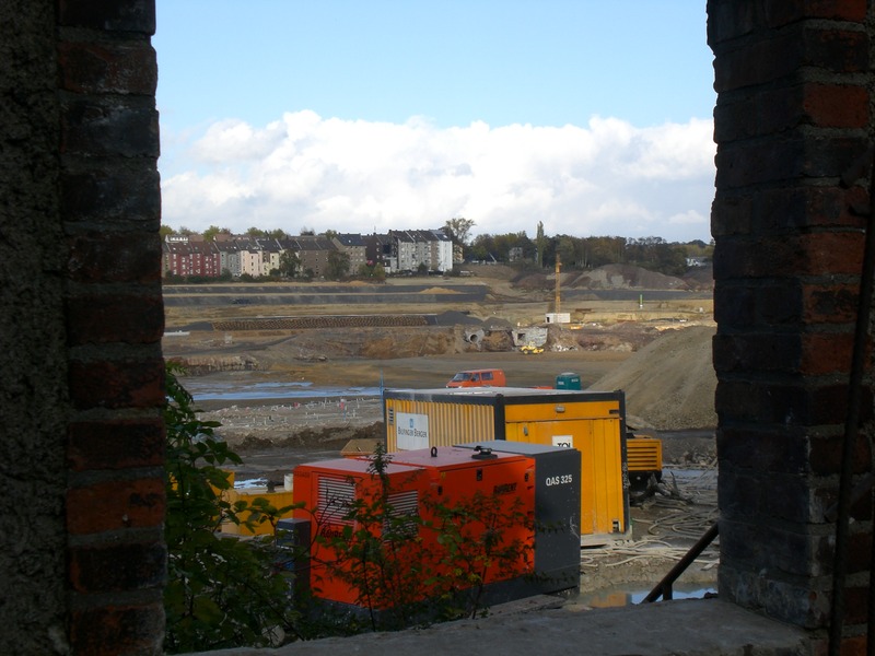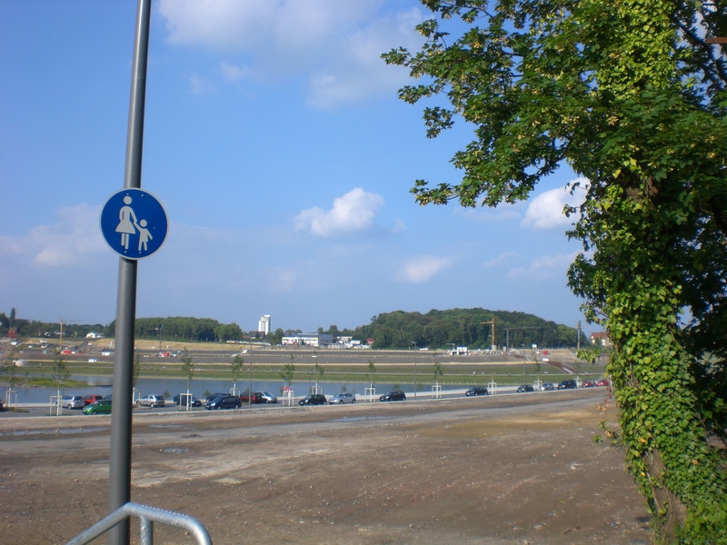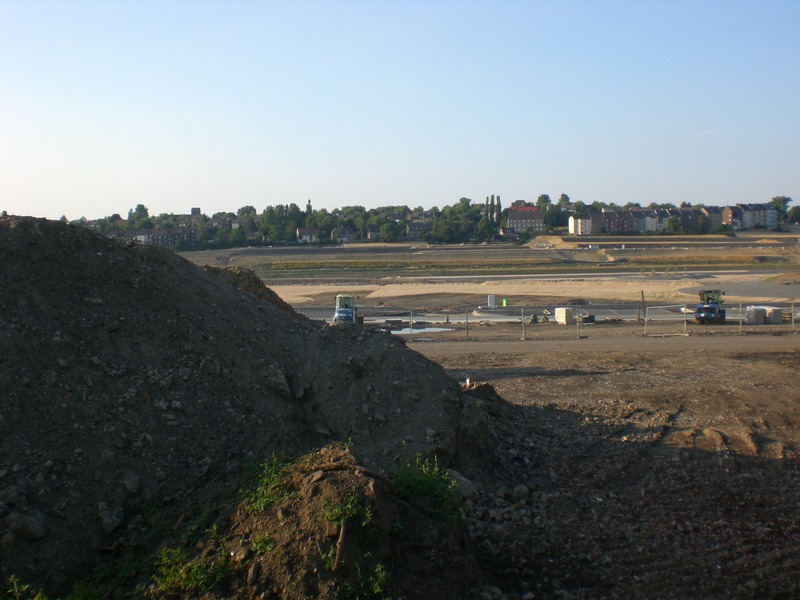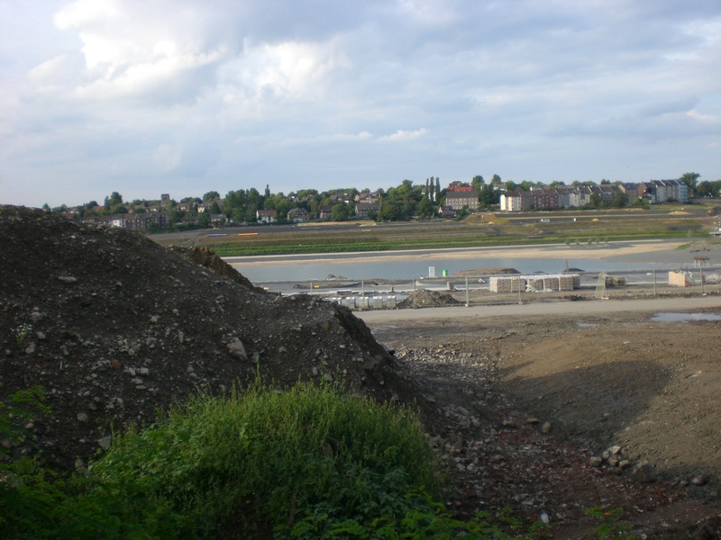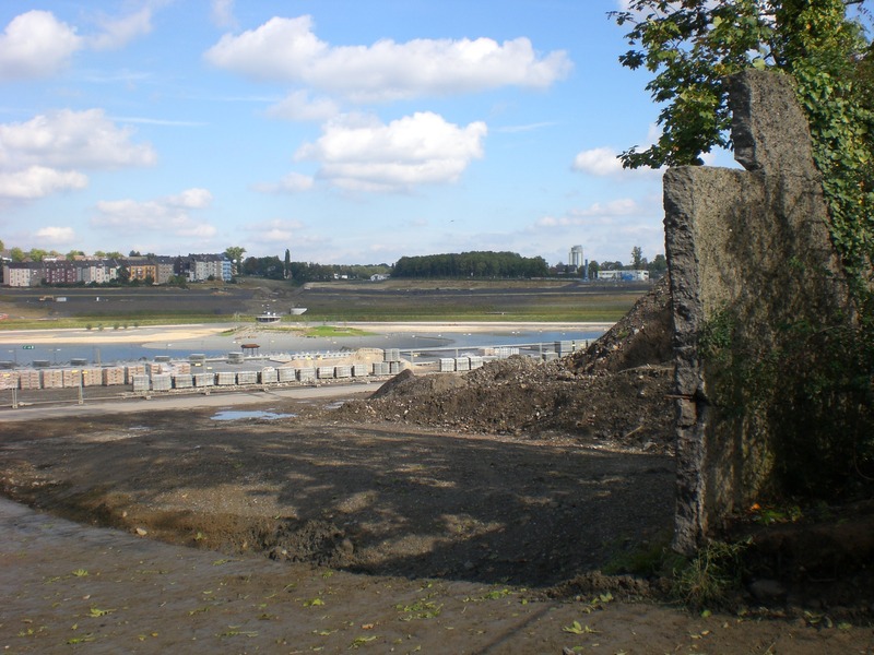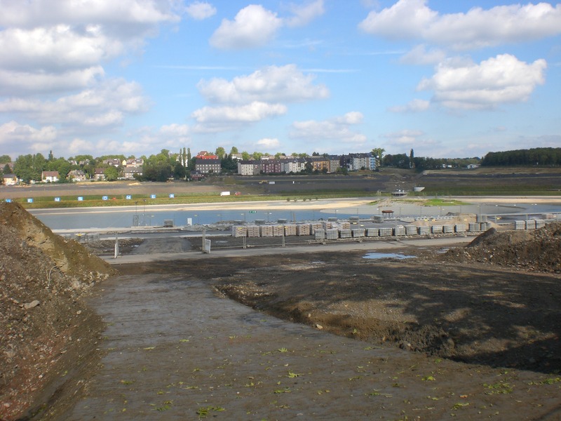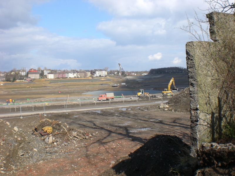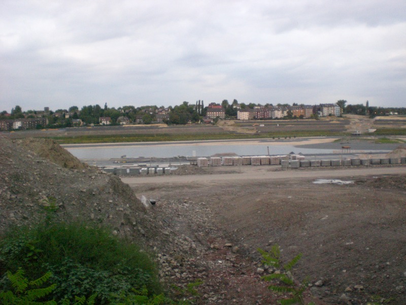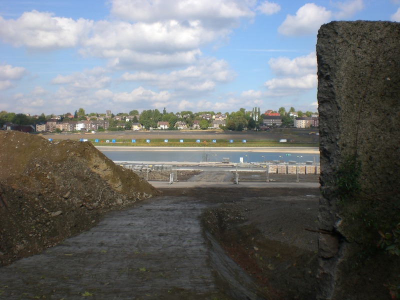 Seit dem Vortag fließt die Emscher wieder als offener Bach über das Gelände des ehemaligen Stahlwerks dicht neben der Seefläche.