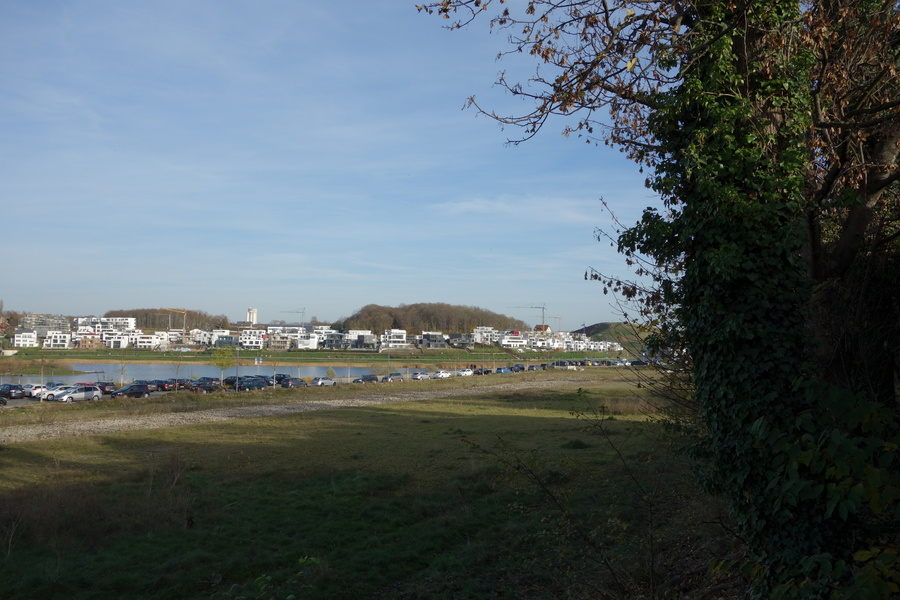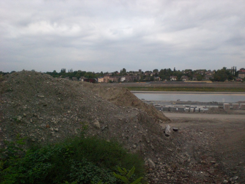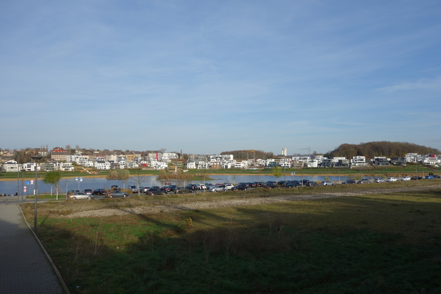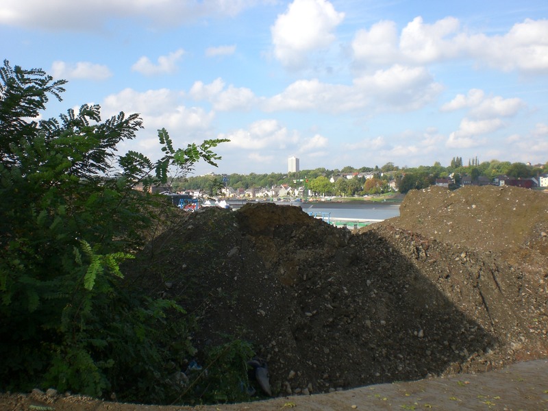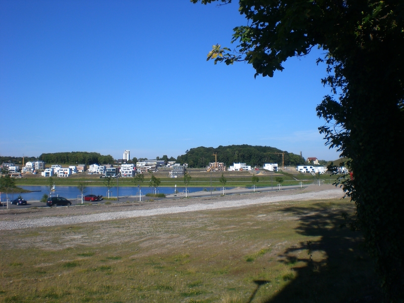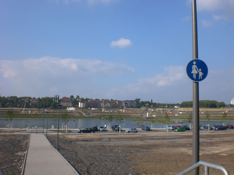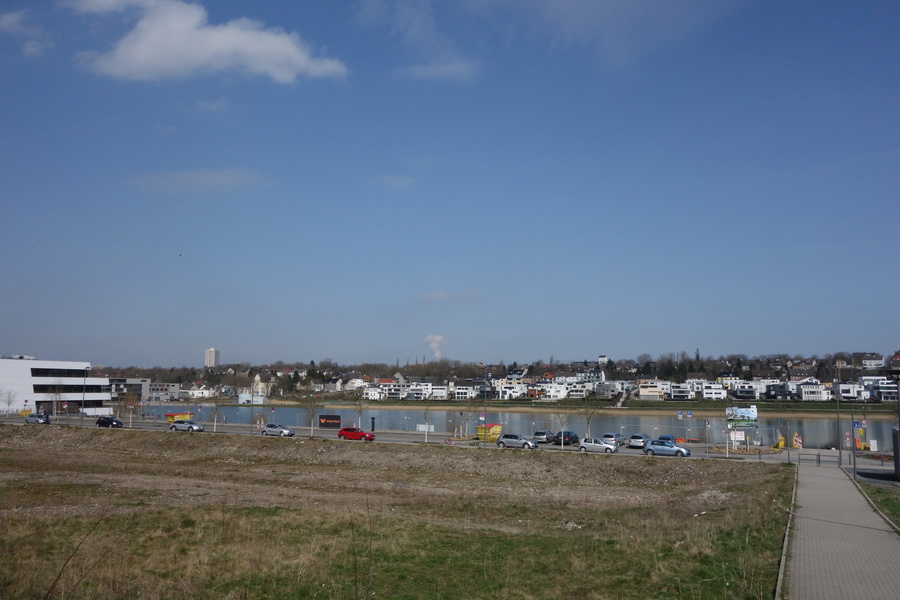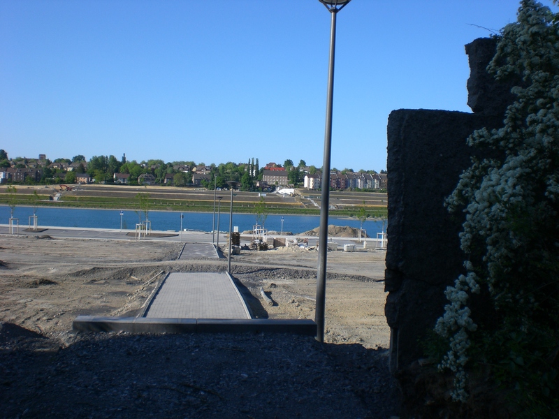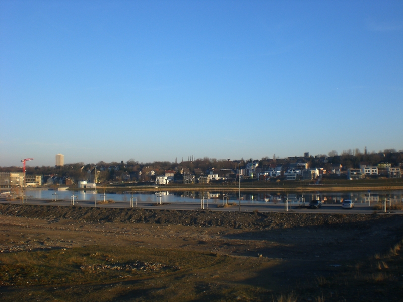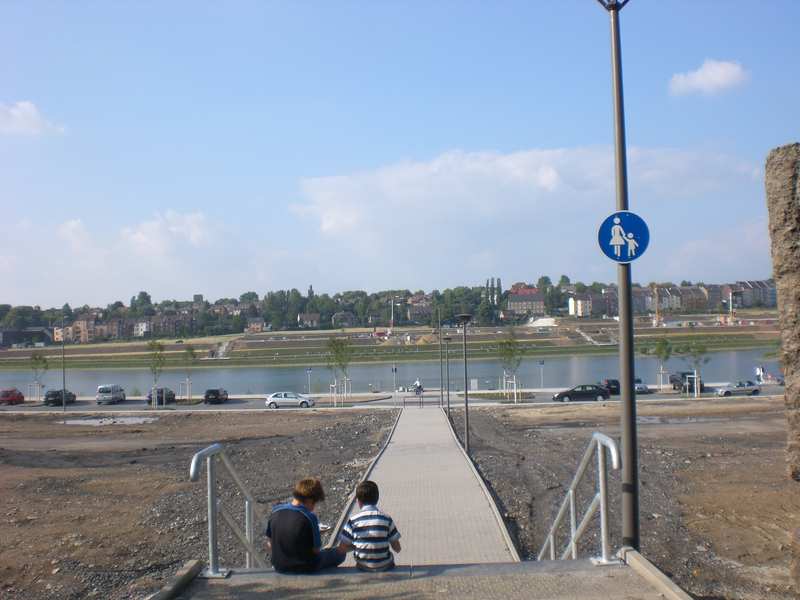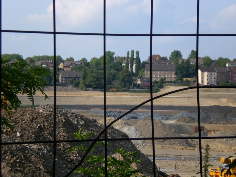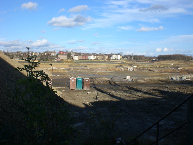 Seit dem Vortag fließt die Emscher wieder als offener Bach über das Gelände des ehemaligen Stahlwerks dicht neben der Seefläche.