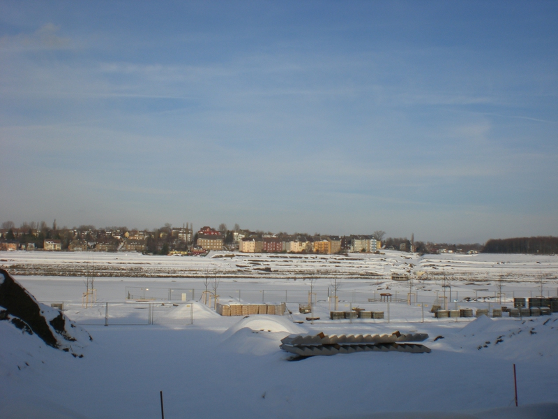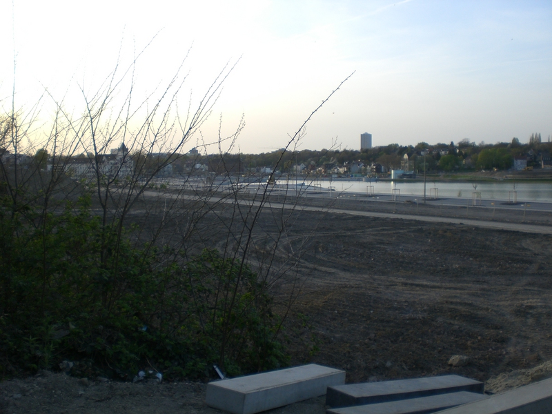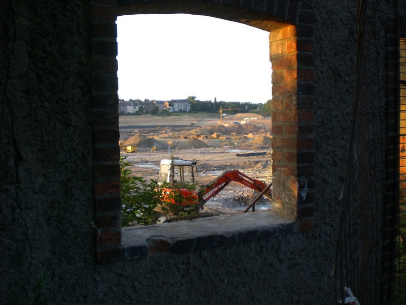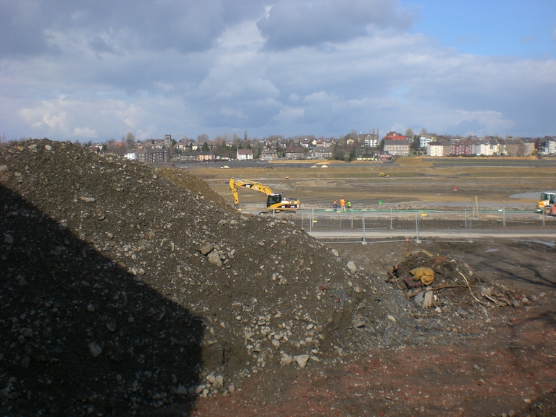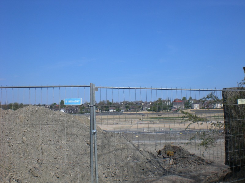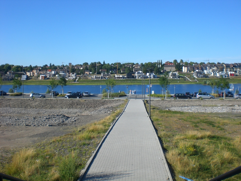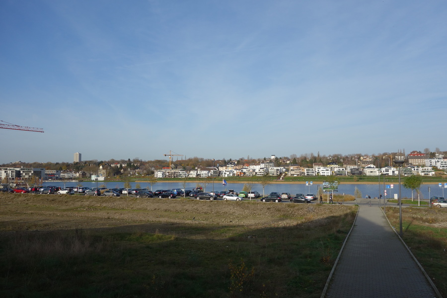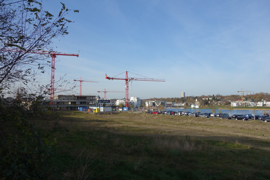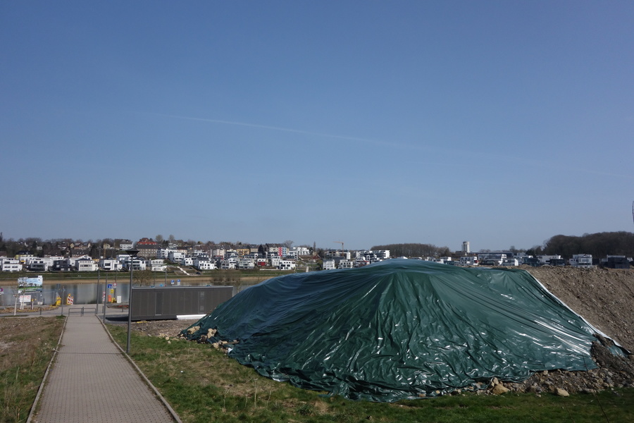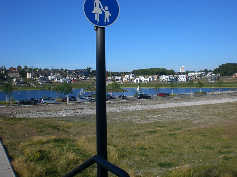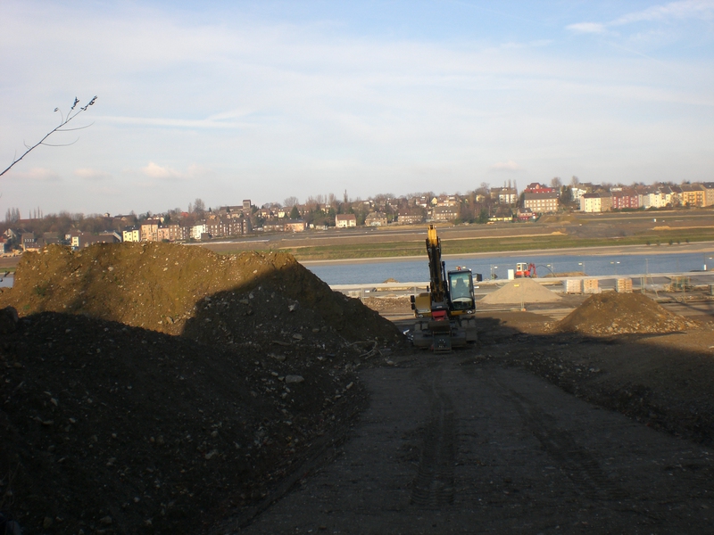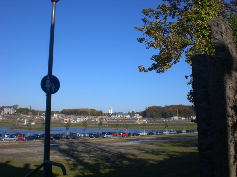 Seit dem Vortag fließt die Emscher wieder als offener Bach über das Gelände des ehemaligen Stahlwerks dicht neben der Seefläche.