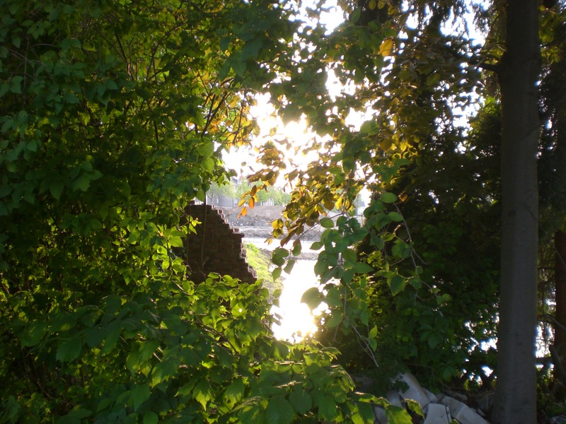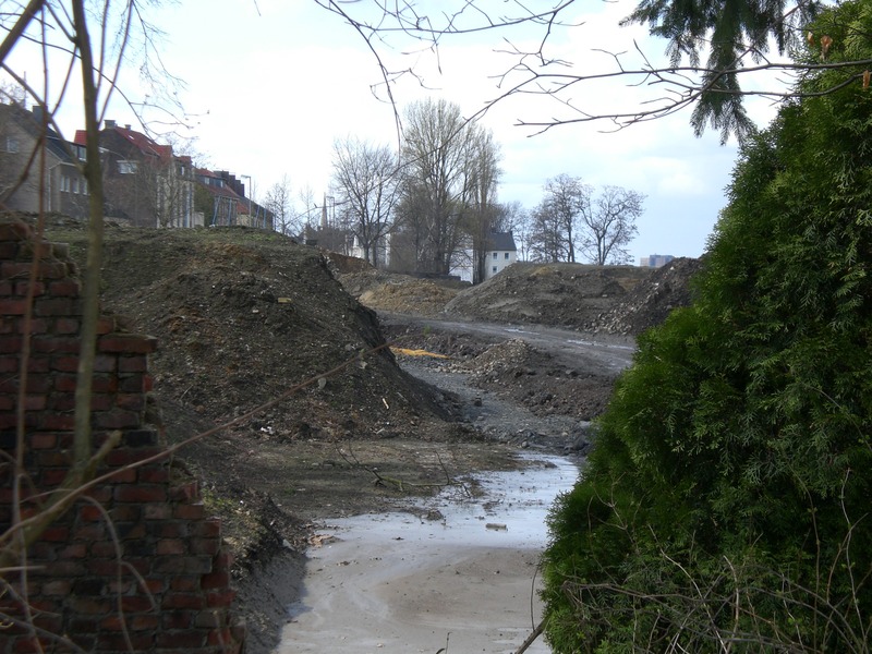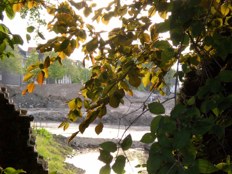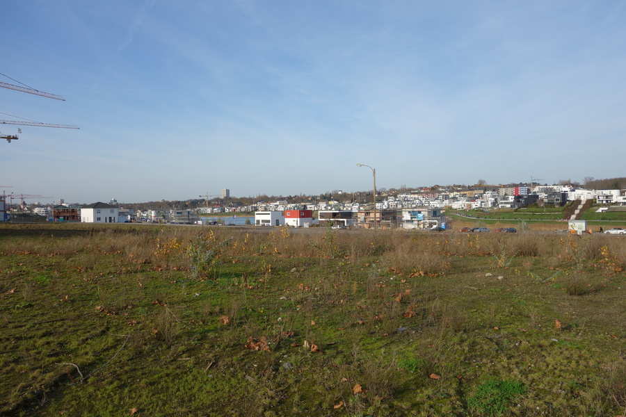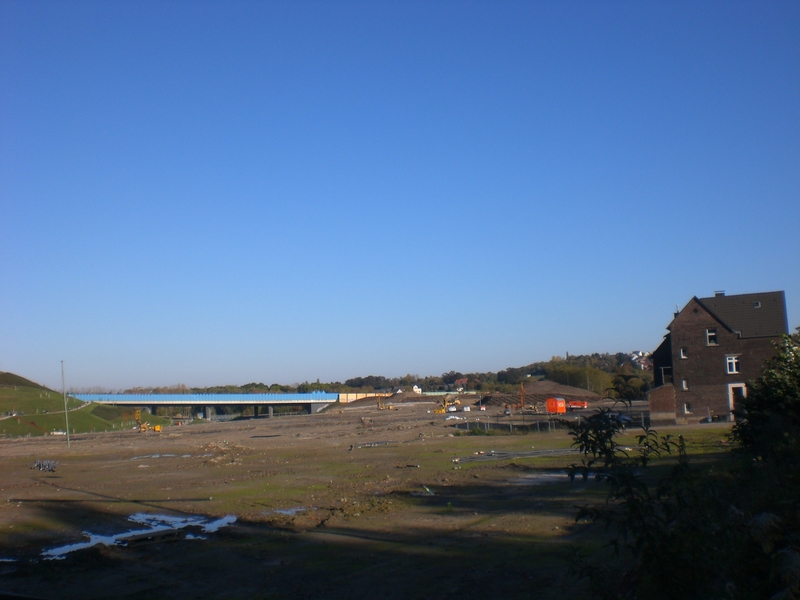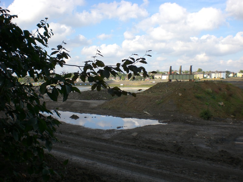 Seit dem Vortag fließt die Emscher wieder als offener Bach über das Gelände des ehemaligen Stahlwerks dicht neben der Seefläche.