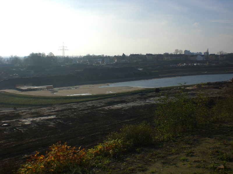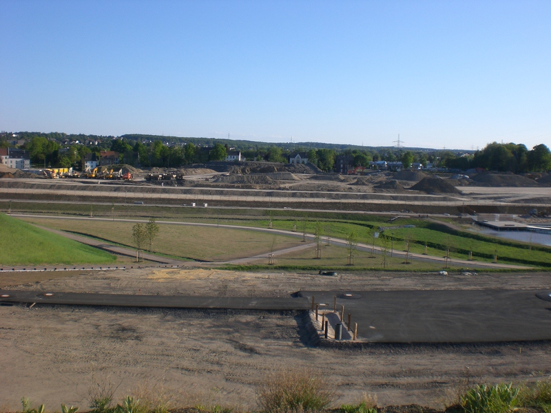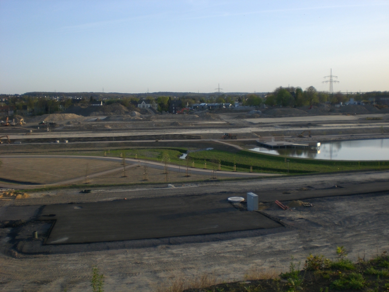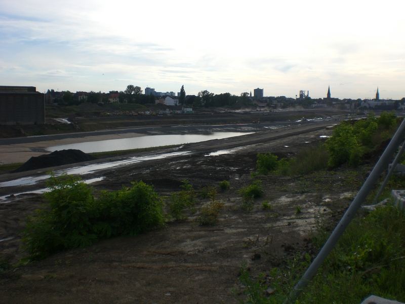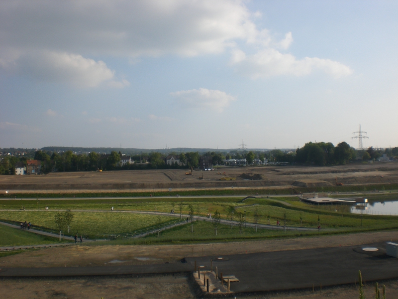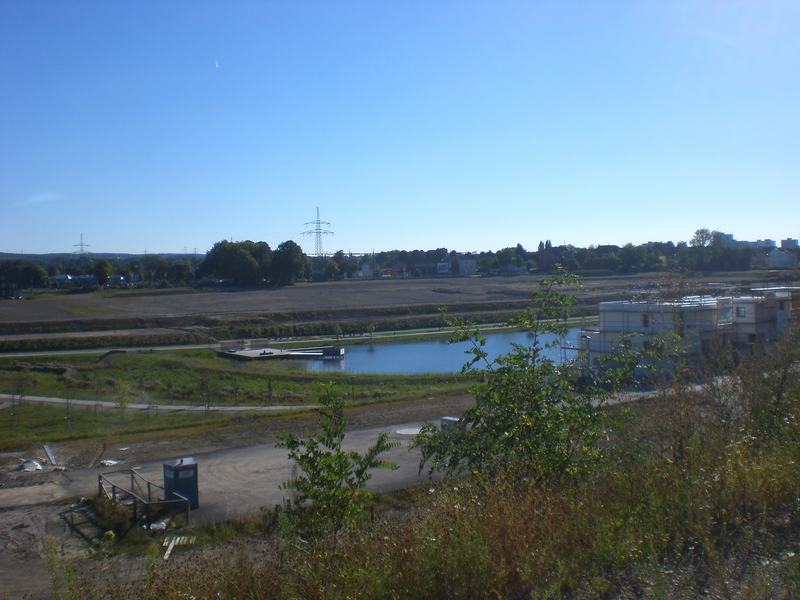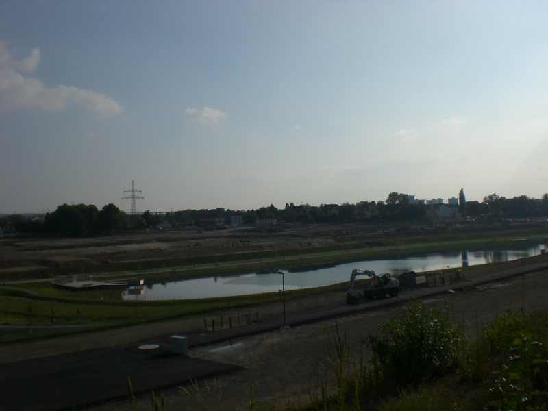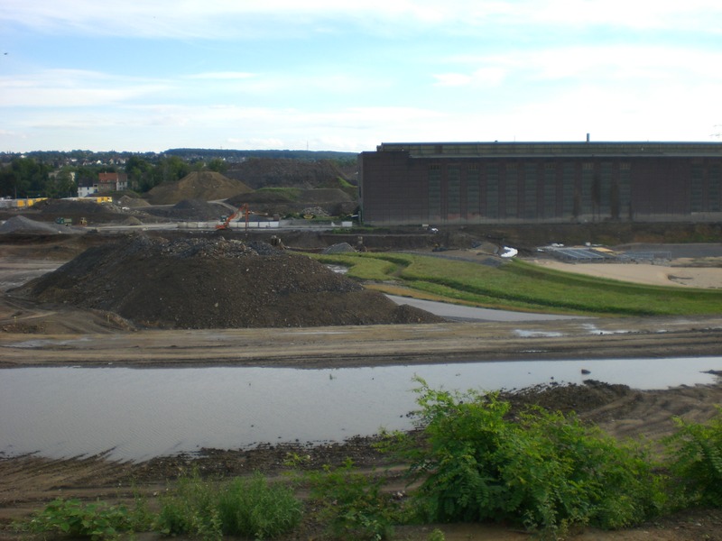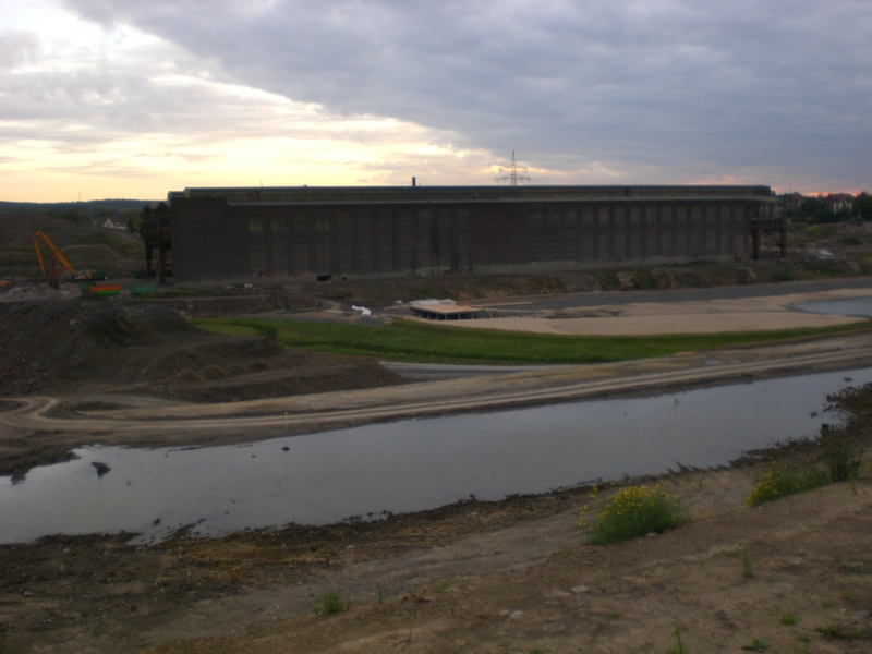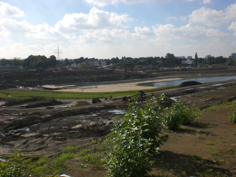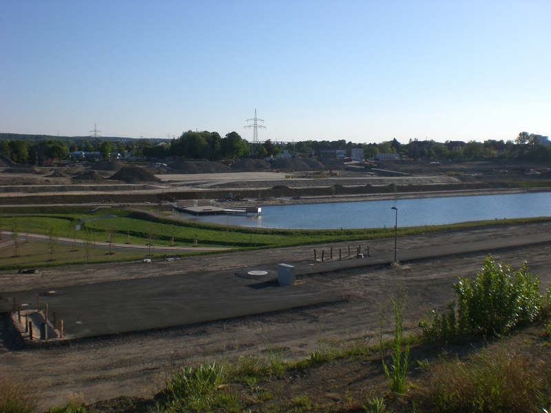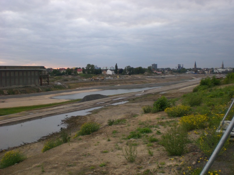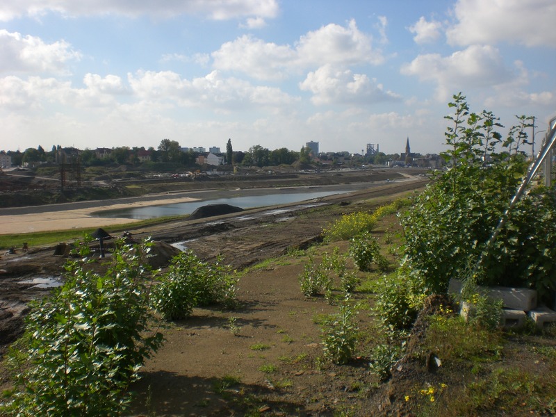 Seit dem Vortag fließt die Emscher wieder als offener Bach über das Gelände des ehemaligen Stahlwerks dicht neben der Seefläche.