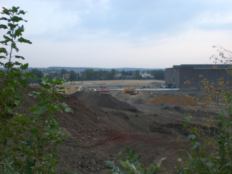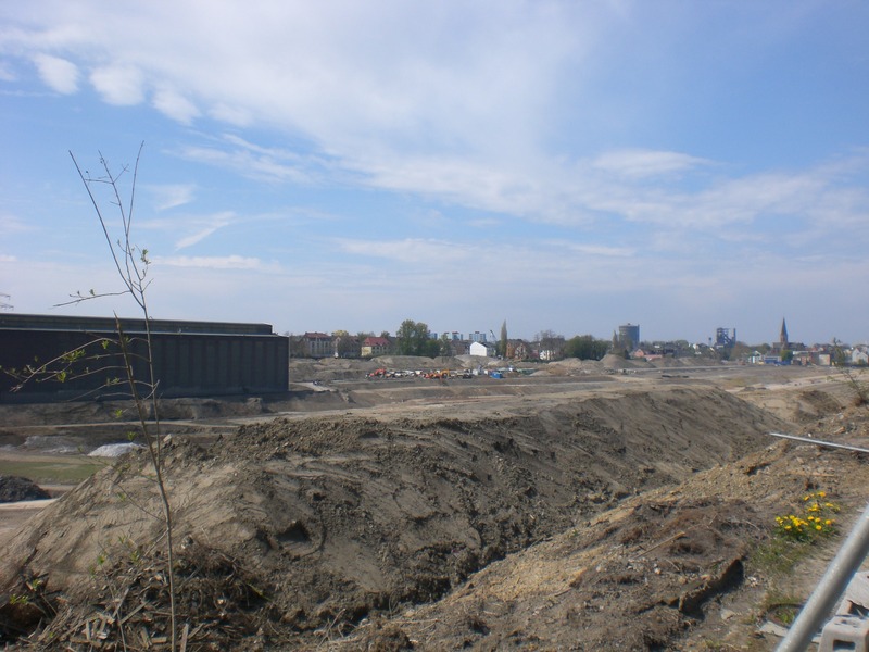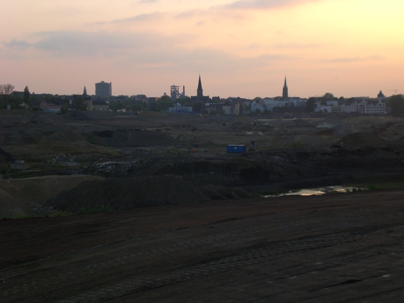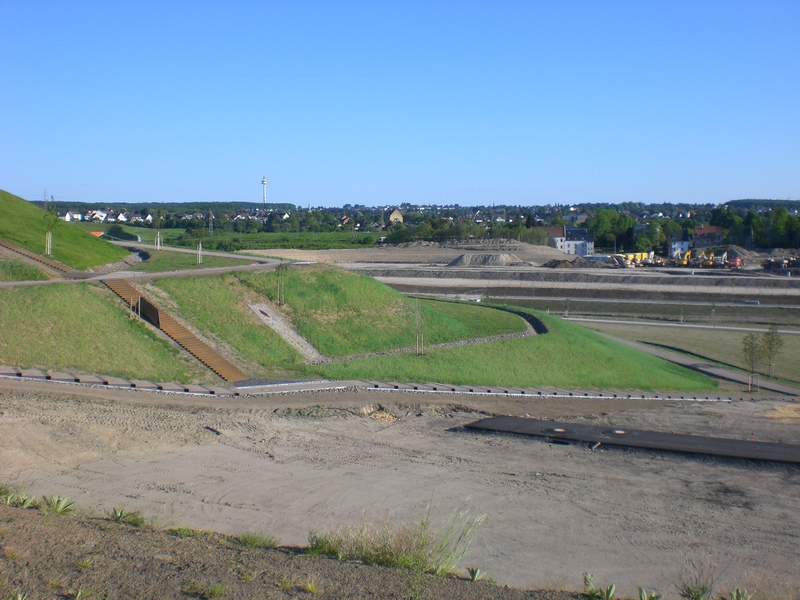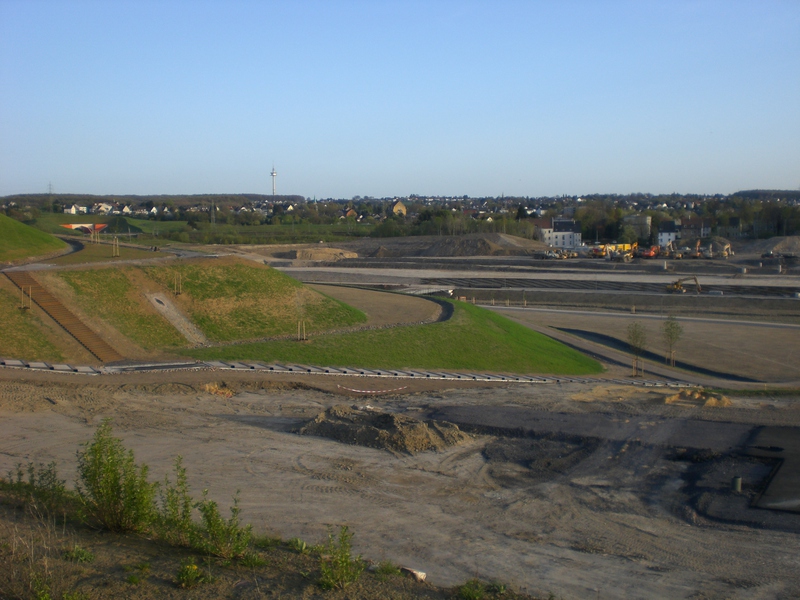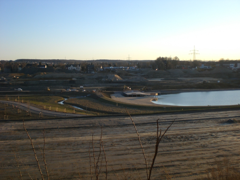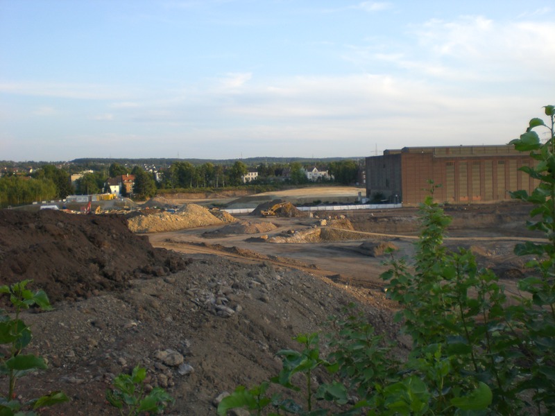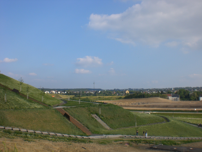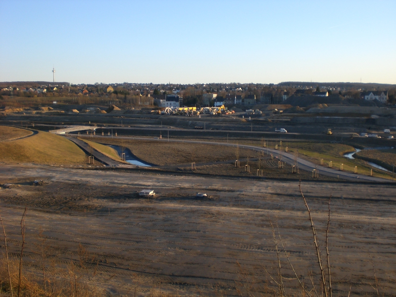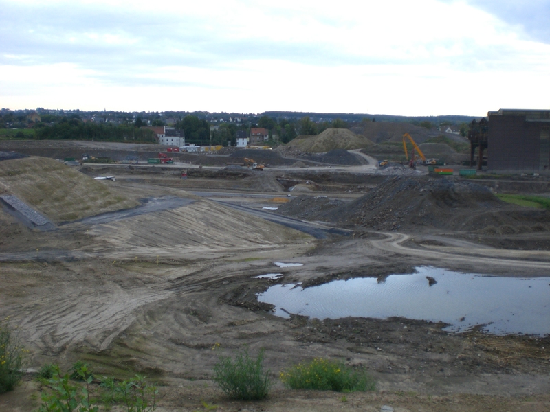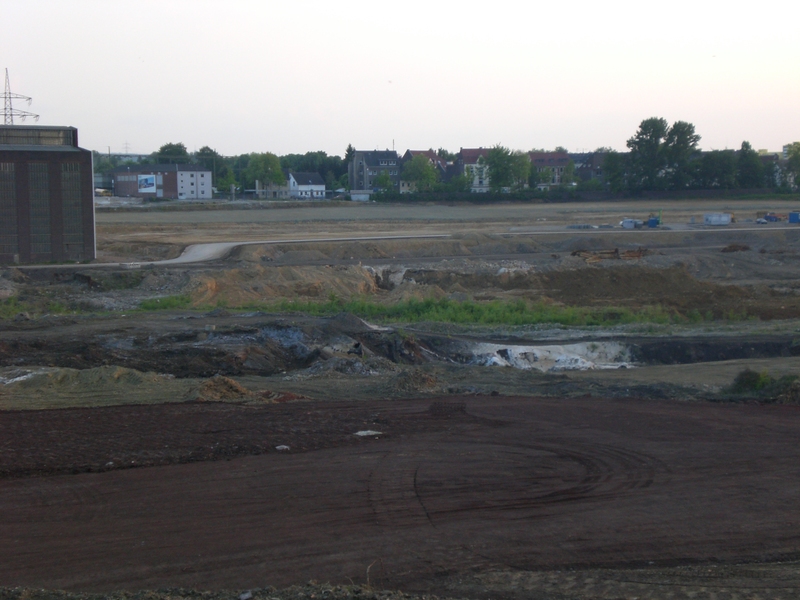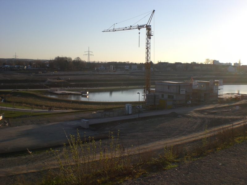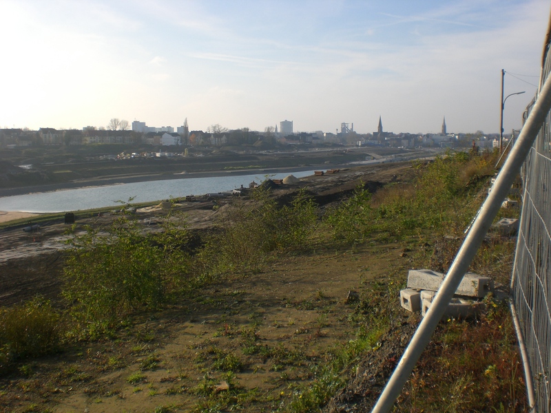 Seit dem Vortag fließt die Emscher wieder als offener Bach über das Gelände des ehemaligen Stahlwerks dicht neben der Seefläche.