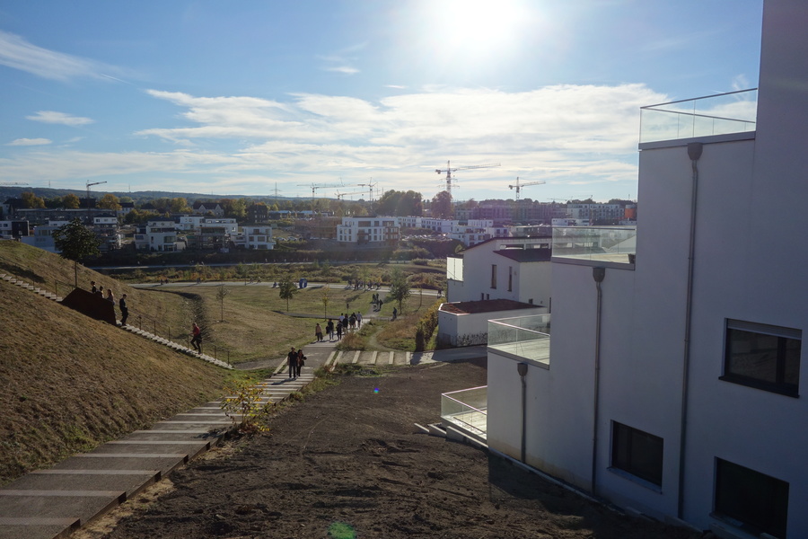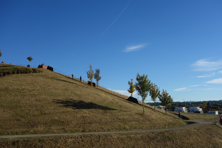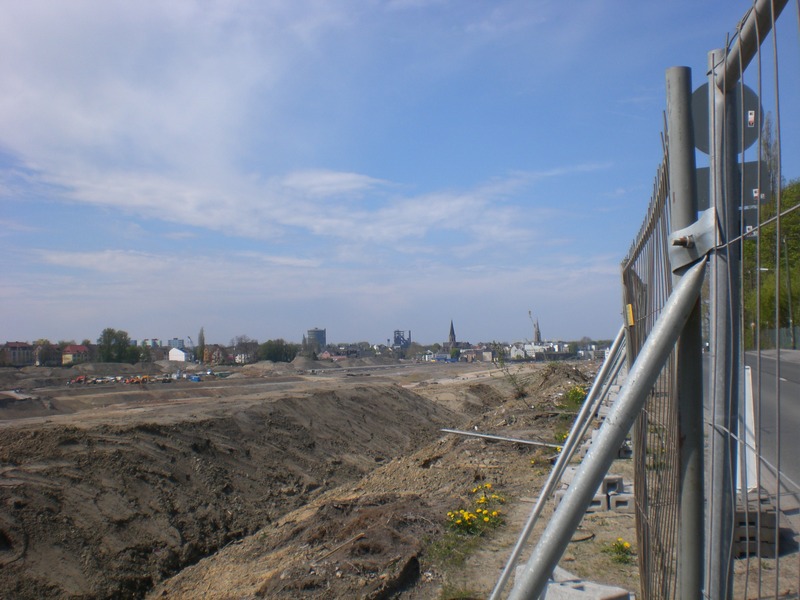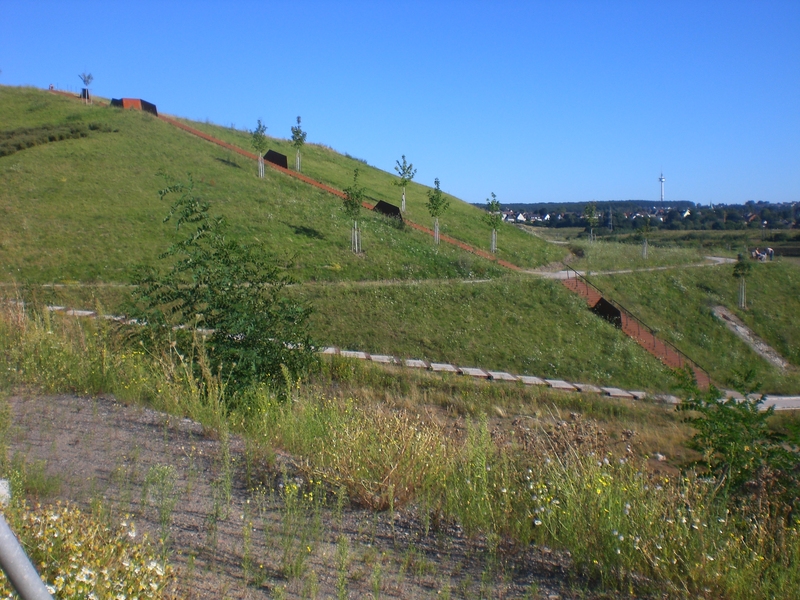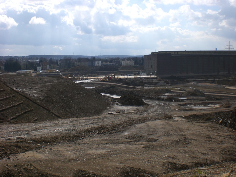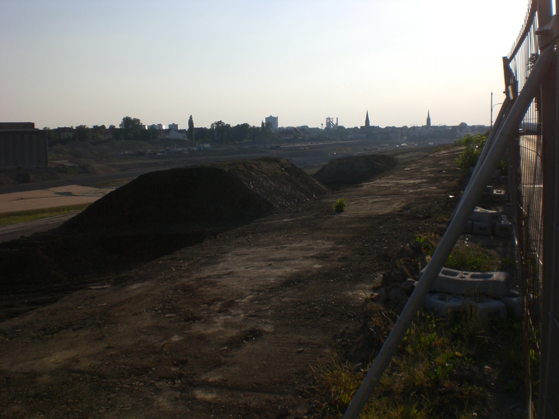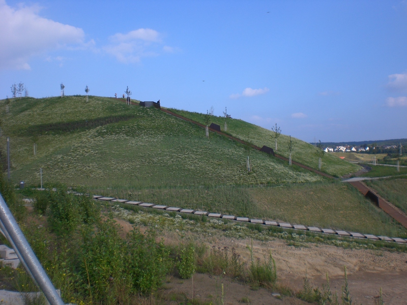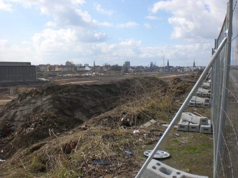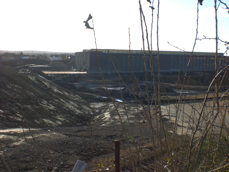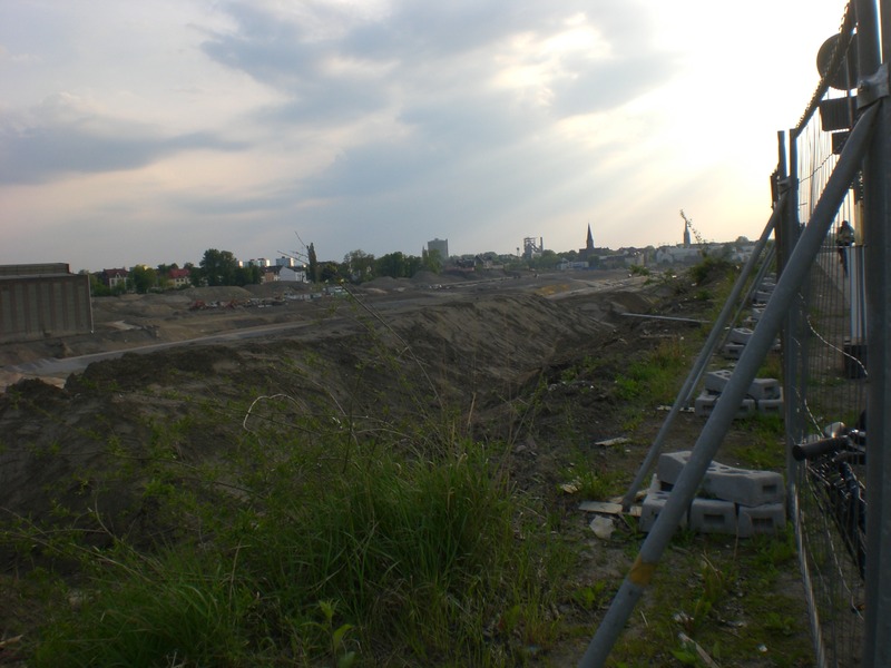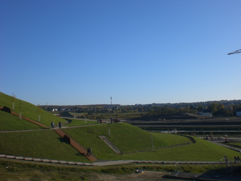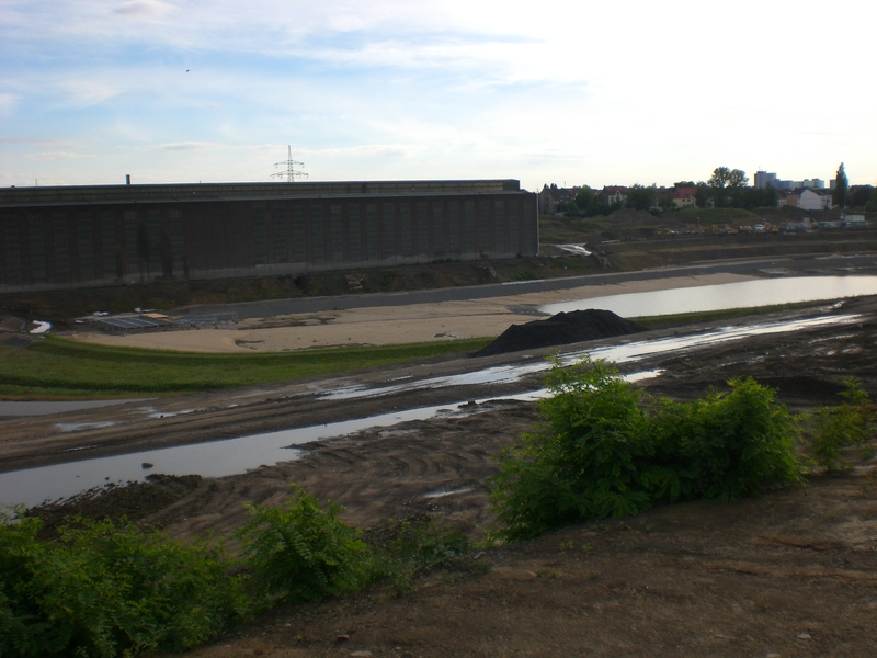 Seit dem Vortag fließt die Emscher wieder als offener Bach über das Gelände des ehemaligen Stahlwerks dicht neben der Seefläche.